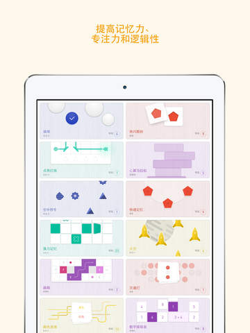 - 15款游戏,共计450关,可以训练记忆力、逻辑性、专注力、反应力和工作速度