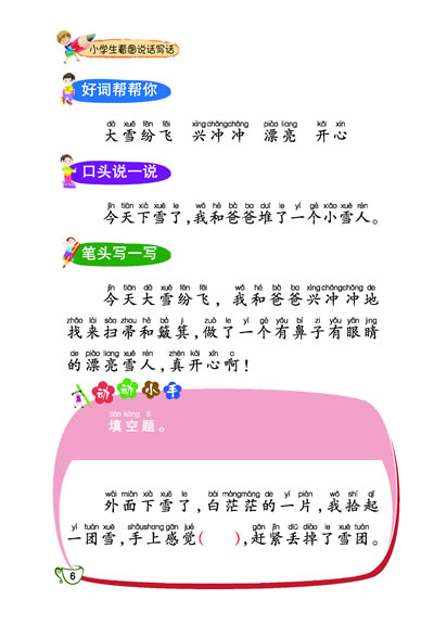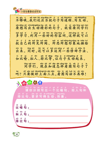 1/1 小学生看图说话写话(1-3年级专用彩色注音版)作文零起步 让你的作文成绩快速赢在起跑线上!火龙果作文 作者: 年龄: 7-10岁 本书针对低年级学生作文学习的要求和特点进行设计,非常适合孩子们的阅读习惯... 作文 语文 教辅 相关图书 猜你喜欢 王一梅教你写作文·小学一、二年级 小学生作文书 注音全6册 1-3-年级 日记起步+注音作文+看图说话写话+学写一段话+好词好句好段6本 手把手教你写好作文 作文起步训练辅导注音版 小学 小学生看图作文 卡梅拉作文全彩趣绘 1-3年级适用(当当五星童书“不一样的卡梅拉”姊妹篇火辣来袭) 小学生看图说话写话(1-3年级专用彩色注音版)作文零起步 让你的作文成绩快速赢在起跑线上!火龙果作文 小学生名校作文全能辅导 海底两万里(增订版) 图书信息 版 权: 作 者: 书 号: 9787566604743 出 版: 更 新: 2019-02-01 07:10:03