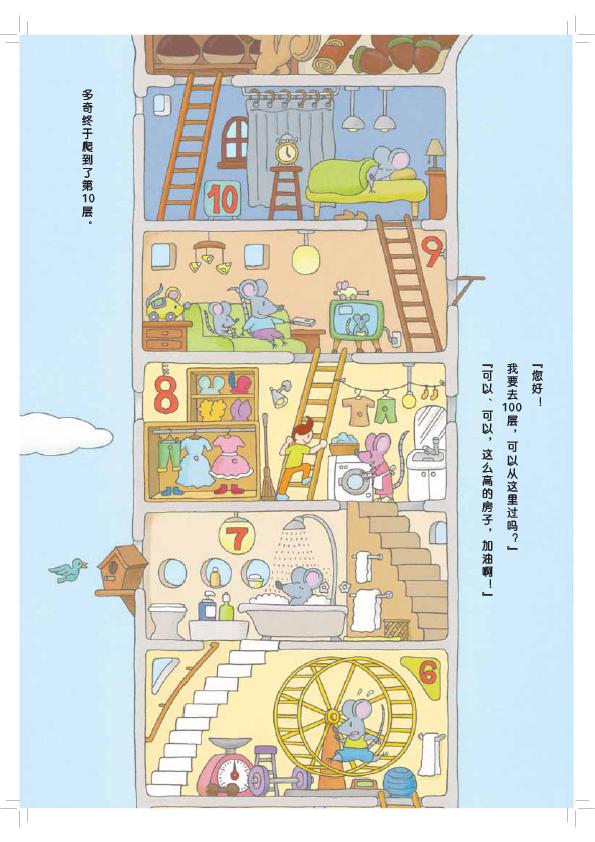 在内容上来看,这可以说是真正拿来给孩子看的书。地上100层讲的是,一个叫多奇的小男孩,喜欢看星星,有一天收到了一封来自100层顶层的来信,邀请他去做客,这样就引出了高达100层的房子。每10层为一种小动物,每一大张有10幅图画展现了每种小动物的生活的图景。比如地上100层这本,小男孩首先经过的是小老鼠的家,有小老鼠吃饭、妈妈做饭、洗澡、老鼠妈妈洗衣服、小老鼠看书、和爸爸一起看电视、睡觉的情形,这和孩子的生活经历很相似,孩子看起来也是很干兴趣的。每页上的小动物都有自己的独特之处,看的时候也可以和孩子一起来猜下一页到谁的家。