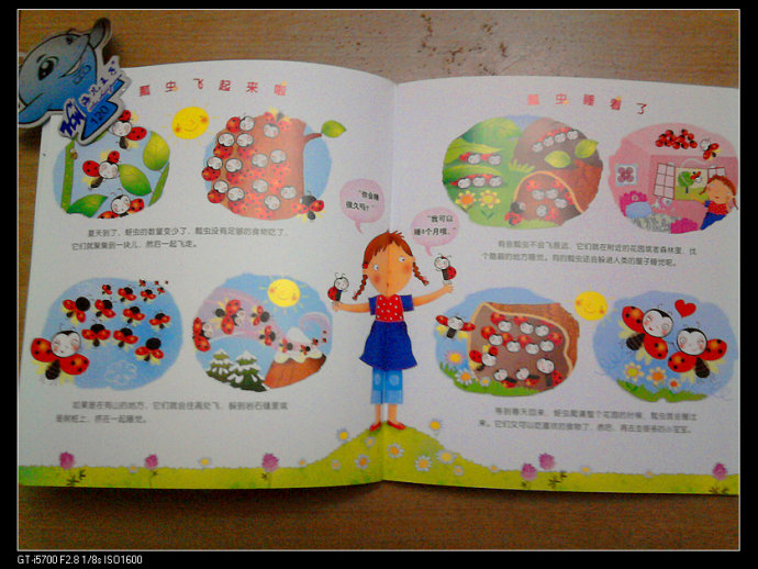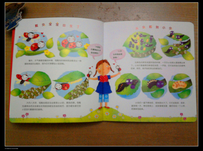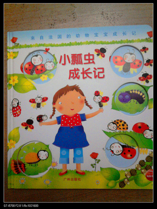 当当当,来看封面,颜色艳丽、活泼可爱,我几乎是一看到这个封皮,就决定要购入了。封皮有五个洞洞,套着的正是小瓢虫成长的五个阶段。这五个小洞洞可以让孩子们把手指放进去,让孩子们的注意力集中到书上来。