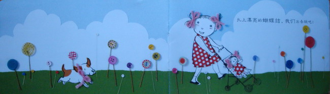 本书中除了绘画外,还采用了摄影、剪纸、布艺的方法,通过精心的拼贴来构图,让画面充满了质感,富有浓浓的生活气息。依每次看到这里,就会说,这些钮扣做的花真好看。呵呵,真的非常有创意。不禁让我想到艺术创想里的尼尔叔叔,每次都能让原本普通的生活用品变为神奇,叹服呀!