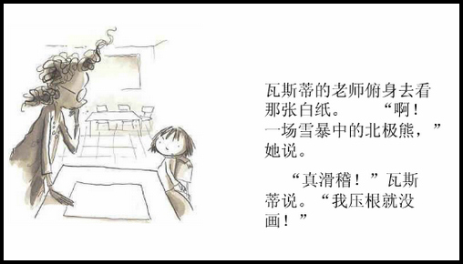 故事内容也很简单:“瓦斯蒂不会画画,白纸上不着一墨。老师跟她开玩笑,你画的是暴风雪中的北极熊吗?” 这个玩笑让我会心一笑,又颇有感悟:在幼儿绘画的初期(涂鸦期和命名期),我们往往无法看懂孩子的画,想要赞扬,也无从赞起;若是不理睬,则会使孩子失去她最初绘画的兴趣。而像这位老师这样,有着充分的想象力,能在白纸上想像出一个有趣的画面,甚至能编成一个有趣的故事,必然大大提高孩子对绘画的兴趣和热爱。