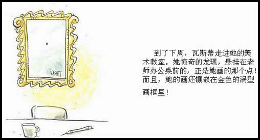 老师让瓦斯蒂在纸上画了一个点,这对每个孩子来说,当然是一件很简单的事情,然后再在点上签上自己名字。一天,当瓦斯蒂来到老师办公室的时候,发现自己的点竟然被老师镶嵌进了画框。这对孩子来说,是多么大的肯定和鼓励。我当然可以比这做得更好!孩子的信心膨胀,创作意识和灵感激发,竟然也被别的孩子当成偶像来崇拜。这时候发生了什么事?爱的火炬传递,瓦斯蒂对那个小男孩说,来,画条直线,然后签上你的名字。