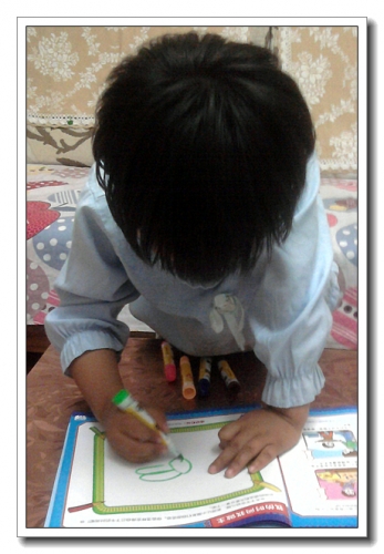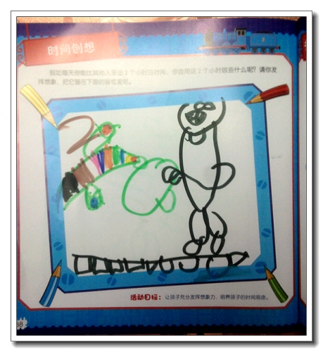 最后两页纸是留着让孩子画画的,与时间相关的主题。一幅是如果老师让小朋友们下午自由活动,你会做什么,一幅是如果每天你比别人多两个小时,你要干什么。自由活动那个,婷肯定是跟小兔子玩儿;让我感动的是两个小时那幅,婷要给我洗碗!!!彩色的水龙头,旁边两个按钮,一个蓝色一个红色,一个冷水一个热水,婷够不着,还要站在小凳子上。怎一个心潮澎湃啊!