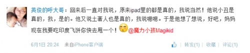 这是来自新浪微博@英俊的呼大哥 在参加完当天活动后发布的一条微博:“孩子回来后一直对我说:“原来ipad里的都是真的”。我说:“当然”!他说小丑是真的,我:“是的。”他又说土著人也是真的,我说:“嗯嗯”。于是他想了想说:“好吧,妈妈现在我要吃印度飞饼你快去甩一个!”