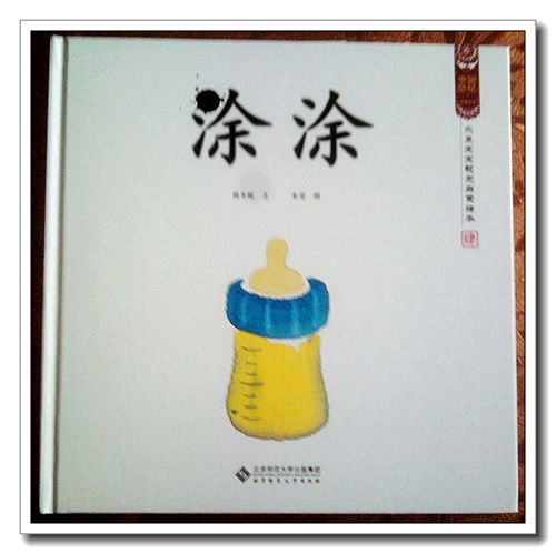 拿到书,我先看。硬皮精装,非常精美。封面是一个奶瓶,黄色的瓶身很有点透明的感觉,硅胶奶嘴也颇有质感。书是针对1岁以上的孩子看的,这恐怕是他们最最熟悉的事物了,婷一看到这个,说,妈妈,我早就不用奶嘴了,后来可能因为实在喜欢这本书,又道,妈妈,是不是里面装着水,喝的时候把奶嘴取下来?“涂涂”二字立体印刷,摸上去凸起来的感觉,婷关注的却是为什么涂字上面有个墨点。