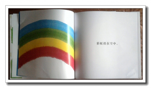 婷最喜欢的是彩虹那页,那当然了,颜色多而漂亮嘛。不过我一直有个疑问,印象中,红色应该在最外层,紫色应该在最内侧。