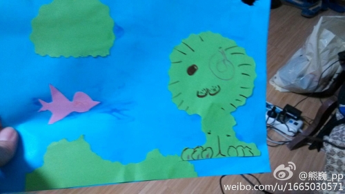 周末回大连参加同学的婚礼,于是忐忑的把孩子扔个爸爸带两天,结果回家之后,发现除了家里乱一些,玩具都在外面还有一些书散落在外面,其他的状况不都错,孩子的情绪不错,不仅确保了每天的正常阅读时间,还跟爸爸一起完成了一幅手工作品,爸爸说周末下雨没带着去早教的艺术课,在家补上吧,于是乎一幅《狮子和小鸟》的作品就诞生了,让人惊喜的是,孩子知道画眼睛了,而且会画眼睛了,作品是爸爸和儿子共同配合完成,爸爸拿着纸,儿子用花边剪子操作,然后涂抹胶水,粘贴,还挺有意思的