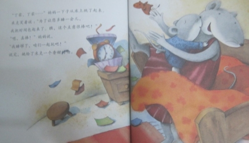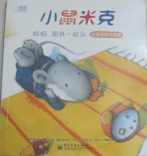 《小鼠米克》的系列绘本中有一个本《妈妈,跟我一起玩》,就是讲的小老鼠米克,一早晨起来想跟妈妈玩,可是妈妈还没有睡够,妈妈让他等到闹铃响了在叫醒她。小鼠米克很听话,就自己玩,玩玩这个,玩玩那个,一直耐心等待呢。也时不时看看时钟,期待着它快点响。可是时钟就像坏了一样,就是不响呢。在等待的过程中,小鼠米克不仅不再急躁,而且还想起来关爱妈妈呢。知道妈妈很累,倒希望闹铃慢点响,让妈妈多睡一会。他就把闹铃藏起来,包起来,让妈妈听不见。可是闹铃还是响了,妈妈还是醒了,跟米克一起玩。