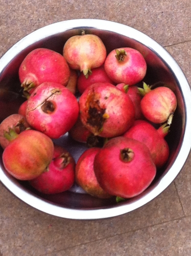 果果是只小馋猫,或者说是一枚标准的小”吃货“。最常用的口头禅就是:我想吃好吃的东西。还好,现在在上的这个幼儿园吃的方面还是比较满意的,基本都是自己做的,比较干净放心。种类也很丰富。另外院子里面自己种了好多的蔬菜和水果,什么小白菜啊油菜啊,还有大枣,石榴,苹果,柿子等等好多。在当前的环境下能吃上自己种的放心的蔬菜和水果是多么开心的事情呀。下面就是幼儿园的厨师爷爷自己做的中秋节的月饼,还有幼儿园的石榴树上摘下来的熟透了的石榴。