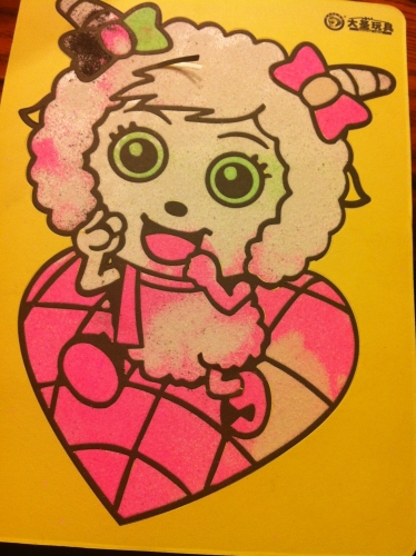 以前就听说过沙画,一直没给孩子买,这次是孩子在早教的老师送了一盒沙画,刚好就带孩子玩起来。可惜这个里面带的沙子颜色不够艳丽,只有枚红色比较鲜艳,所以孩子一直总是挑选这个颜色,结果导致涂出来的喜羊羊大部分部位都是枚红色了。再就是沙画最好还是在户外玩,沙子很容易弄的到处都是。不太好收拾,如果家里有小宝宝的话比较不够卫生。下面就是果果的沙画作品。