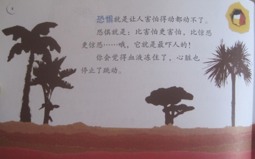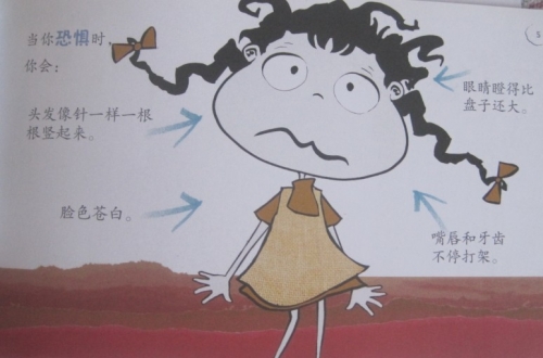 《我的感觉.成长版》之《恐惧和冷静》像孩子呈现了两个不同的感觉:恐惧和冷静。妞看到书名的时候也问我什么是恐惧,什么是冷静?书的作者显然知道小朋友会问,而这种抽象的感觉名词,确实不好解释。书在一看头就介绍了恐惧,通过形象小人,语言描述,感觉形容多角度来介绍什么是恐惧。通过三四页的介绍,对恐惧有了初步了解,可以继续欣赏故事。