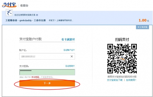 输入您的支付宝账号和密码,点击下一步,见下图:
