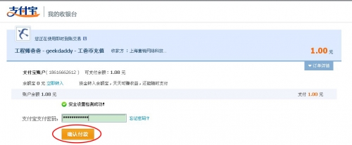 输入您的支付宝密码,点击确认付款即可充值成功啦,见下图: