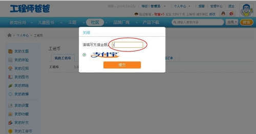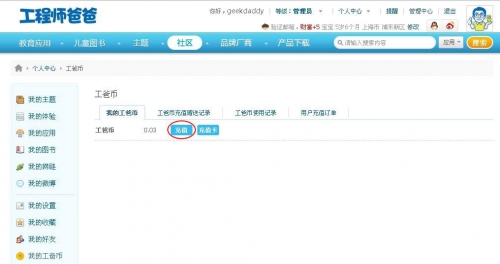 浏览器内输入:http://www.idaddy.cn/(直接搜索工程师爸爸也可),打开工程师爸爸官网。登录您在故事口袋听听里的账号,找到个人中心,选择工爸币,见下图: