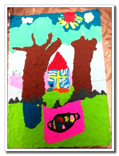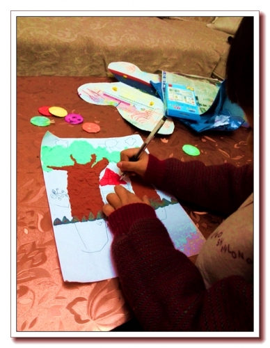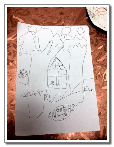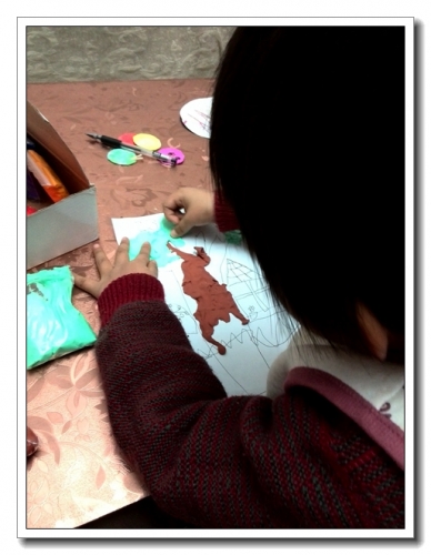 我们用纸粘土把画绘出颜色,婷对颜色很有自己的感觉,精细动作也不错,能把纸粘土铺满画面的细节,比如栅栏的尖顶、树叶的边缘。窗户上的白色是玻璃的反光,窗台上还放着一盆花。大树下面的蓝色貌似来源于小巫女过圣诞里面的那个筐,婷认为那是保护大树的。