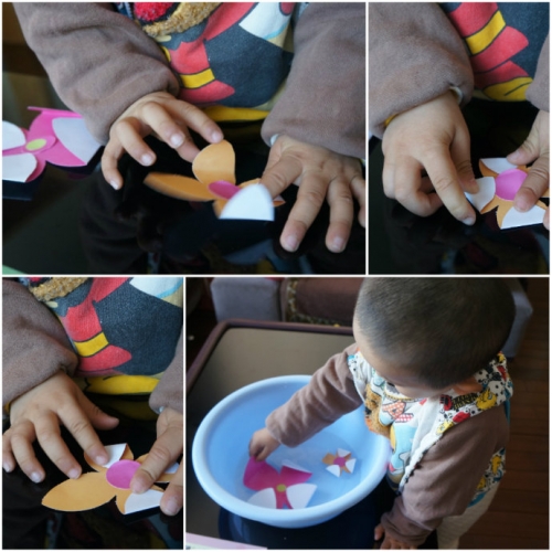 不过可惜的是,第一次实验,儿子失败了。因为他把纸花放到盆里之后不停用手触碰纸花,结果纸花因为不平衡,导致很多水跑到纸花身上,全都被浸湿了,花瓣懒洋洋的躺在了水里。第二次,我又给宝宝剪了两朵小纸花,告诉儿子为什么上次实验失败的原因。这次儿子轻轻把叠好的纸花放入水中,只看不动,果然,神奇的纸花在盆里迅速张开。下一次,我可以给孩子进行引申实验,例如可以找来不同材质的纸,分别做成纸花,让孩子观察不同材质纸花吸水的速度。如果以后科学小超人能在书里给小朋友选三种不同材质的纸花更好哦:)