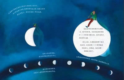 这本书的故事其实是一类叠加类故事,而故事的内容和《月亮的味道》有那么点相近的地方。但这本书又有自己的特色,例如作者很有创意,把月亮的阴晴圆缺用另一种说法解释了,虽然不科学也不靠谱,但充满了童趣。有人问为什么要用布把月亮遮住呢?书中给了答案:因为遮出来的月牙儿能让夜空变得更美,还能让人感觉到时间流逝的节奏。