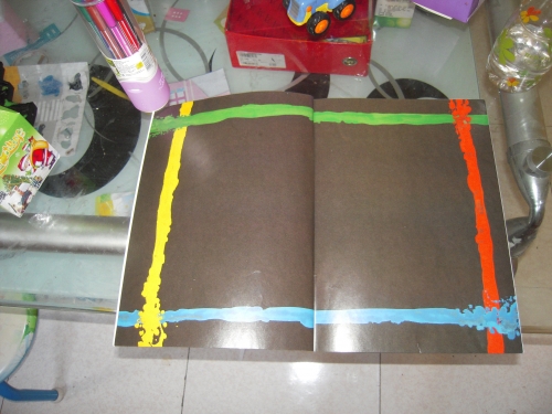 孩子最近又重读《女巫温妮》这两套书了,这一次重复阅读有了新的收获,比如上图这是第一本《女巫温妮.》的环衬部分,我问儿子这个图中红黄蓝绿是是什么意思,儿子说:这是温妮用魔法棒吧黑猫威尔伯变成了绿色,黄色、蓝色和红色·······说的真好孩子!