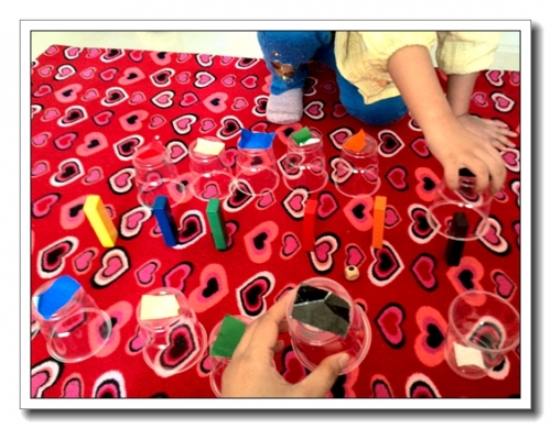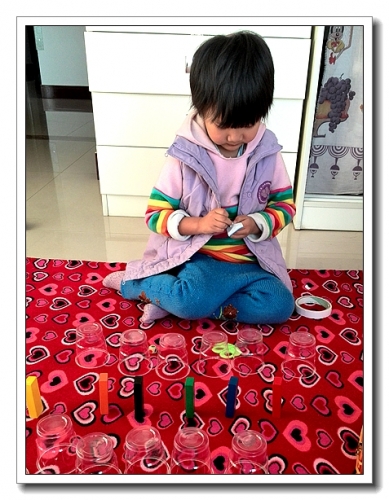 非常简单,孩子可以自己完成,6种颜色的色纸随意剪成形状,分别粘贴在杯子上。可以多人游戏,增添乐趣。我和婷只做了两个人的。每人面前一套纸杯,中间放6种颜色的积木,然后轮流置色子,扔到什么颜色就用同种颜色的杯子去扣同种颜色的积木,先扣住的赢,扣错了的罚。婷有点小赖皮,偶尔扣错了却不肯认罚。