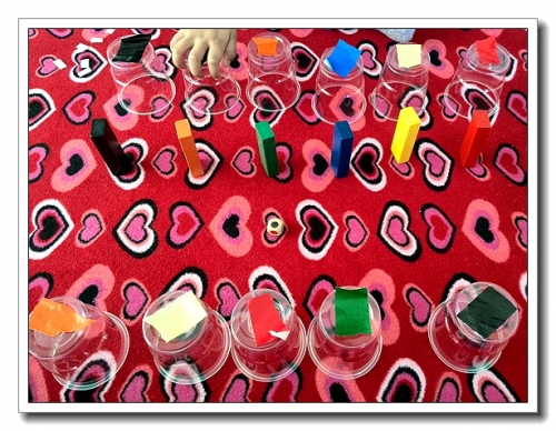 再后来又增加了一点难度,扔两次(个)色子,一次是杯子的颜色,一次是被扣的积木的颜色。