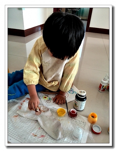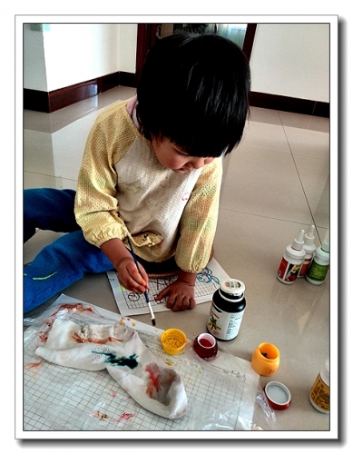 铺好废纸,铺好塑料布——预防工作不做好,把地板弄脏了擦不起来的话,会被老公臭批的。水粉颜料用完了,这边只有食用色素可用,婷上来就用笔涂抹,颜色非常干。我用一个小滴管瓶给她示范,把水滴在颜色上和先滴水然后再上色有什么不同,结果婷玩滴管都玩得不亦乐乎。