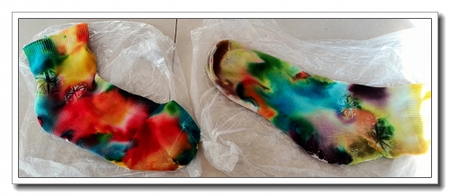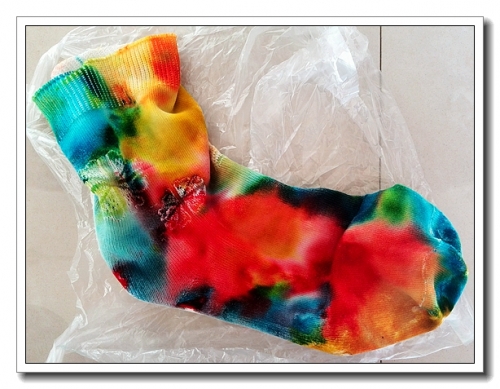 我们把袜子晾晒到阳台上,还以为干了后会不那么鲜艳,可是下午醒来,颜色还是蛮亮丽的,婷都舍不得将她的作品扔掉了。