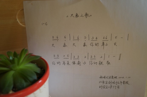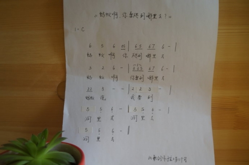 P.S.儿子的歌曲已经从之前的纯旋律发展到词曲完整了,几乎每次都是一气呵成,妈妈必须时刻紧跟宝宝的步伐,否则就会遗失这成长中的旋律。妈妈所记录的词曲仅仅是记录而已,尽可能给儿子的原创还原到最原始的状态。