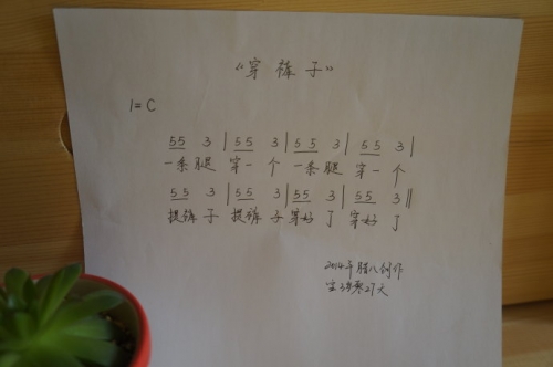 第三首歌曲是腊八那天某天下午儿子睡觉起来我陪他一起穿衣服在他自己提裤子的时候突然他唱起歌来整个曲子只有“3”和“5”两个音歌词和曲调都很简单但很上口之所以只有两个音也许是受到奥尔夫的“五音旋律”的影响2个多月前我带宝唱了4首奥尔夫音乐里非常非常简单的“五音歌曲”有些的确简单到只有“3”和“5”两个音但正是这样的音乐非常适合小宝宝