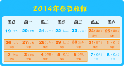 值此新春佳节来临之际,工程师爸爸给大家拜年啦!恭祝大家在2014年幸福快乐,心想事成,阖家欢乐。今年春节工程师爸爸的放假时间为: 1月24日——2月7日(农历腊月二十四——正月初七);2月8日(正月初八)正常上班 。