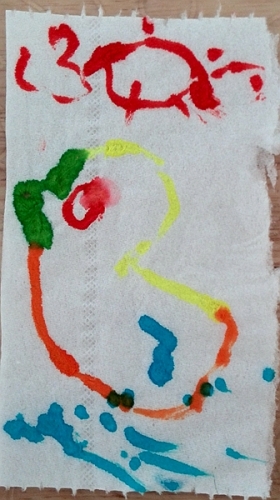 老公拍了给我来看,婷在卫生纸上画的,仔细看,果然很可爱,颜色搭配非常漂亮,是婷最喜欢的五种颜色——红黄蓝绿橙。小鸭子头上有艳阳高照,脚下有浪花