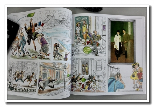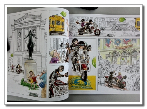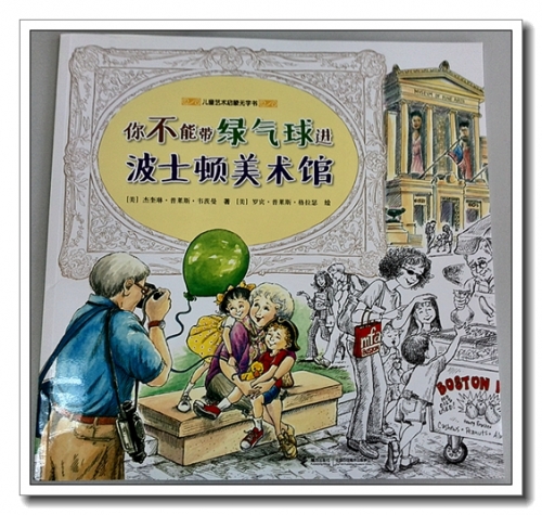 看封面,感觉此书的特点是主要的人物和情节会用彩色,背景人物则制作为黑白。故事从一家四口(我固执得认为是姥姥姥爷带着外孙女和外孙)取波士顿美术馆开始,小女孩拿着一只绿色的气球,可是美术馆不允许带气球进入(也没有自动储物柜),于是姥姥让姥爷带着孩子们进去,自己在门外等候——好像我的母亲,她也经常这么做。