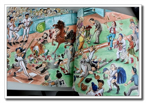 气球像一枝针,把故事里的一个个热闹的场景和一幅幅的高雅艺术品连在了一起——姥姥和警察抱在一起,对应《布吉瓦尔之舞》;年轻人表演杂技,对应《马头观音》;棒球捕手,对应《调查员》……充满了幽默和想象力,同时也让艺术离我们不再那么遥远。