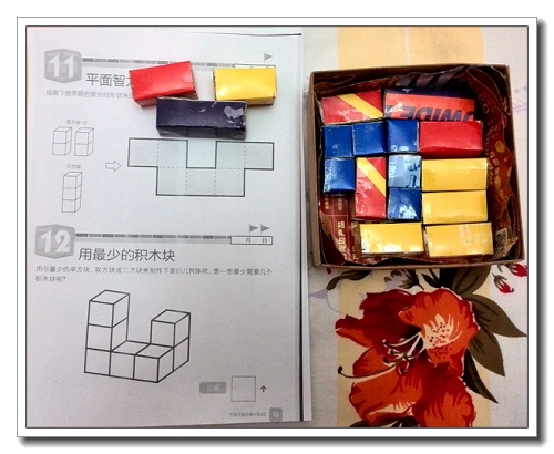 因着看到有试读《立体王》的书,就去百度了一下,找到了电子书,打开看看,工具很好自制。又看到有人说打印出来的比例貌似失调,所以做成的方格会变,所以很多人是tb上买了积木块,不贵(但邮费到我们这里不便宜),可是家里的垃圾(玩具不玩就是垃圾啊)已经实在太多了,犹豫再犹豫,看到手头的快递袋,还是自制了。找了个别人绘制好的图形,打印在A4废纸上,贴在快递袋上剪下来,用胶纸带粘好。想到有人说不稳的问题,根据老公以前的建议,往里面塞了满满的卫生纸。特意用不同颜色的袋子制作,很漂亮,有点积木的感觉吧,话说我后来都有点折盒子上瘾了。黄山带回来的小吃盒子,正好收纳。