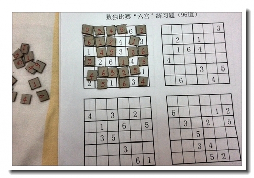 先让婷做4宫格(去年用颜色做过),趁她没有不耐烦之前,挑战了一下6宫格。我在旁边指点,主要是提示她可以先考虑哪个格,婷考虑一下,就能填上正确的数字,完成了一道6宫格的题,细心、耐心,很棒啊!