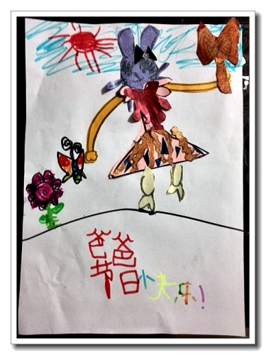 自己找来我刚买回的珠光纸,每种颜色都要用到,各取一张,每张纸上画了一个部位,然后开始剪贴。整整一个小时,婷完成了这幅作品。