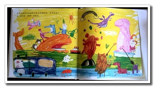 读书的时候,婷跟我的互动很多,一会儿说小蓝蜡笔说自己又矮又胖,是不是因为它用的短了,所以看起来就粗了;一会儿说粉蜡笔夸妹妹涂色很棒言过其实,因为颜色分明有许多越界;一会儿说看黑色的彩虹。