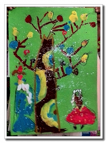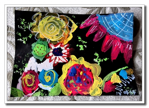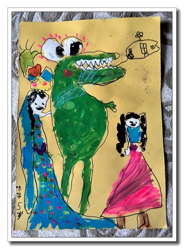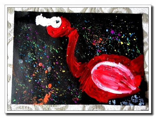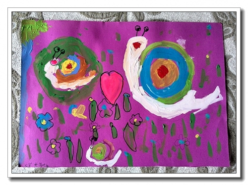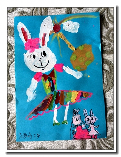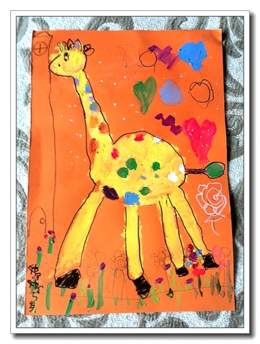 这些画单独拿出来看起来很漂亮,可是跟一起上课的孩子们比起来,也没有什么特别之处,有些孩子比她还小,画面也非常精彩。反不如婷自己发挥的更有特色,也许是技巧不足,也许是可以自我发挥的余地不多,也许是时间不充分。老师说婷的想象力有,动手能力也有,欠缺的是技巧。跟我想的一样。所以我也不强求婷非要去,可是我不懂绘画,倒是一些以前疑惑的问题,被婷指点——比如那些大大小小的点点,经常能在孩子们的画面见到,我却想不到是如何做出来的,问了婷,才知道是两只笔磕碰形成。而且老师会教一些配色、构图方面的知识,也更系统。