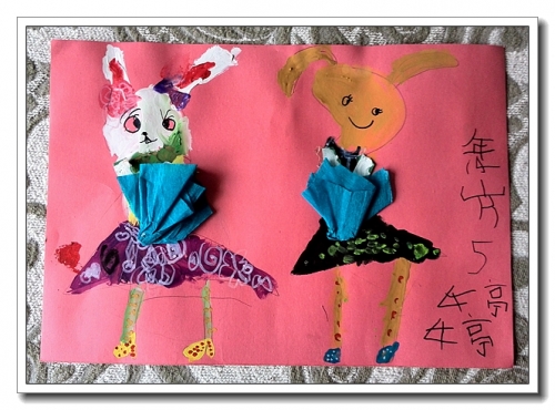 这是一对双胞胎,我问她为什么有个女孩四条腿,婷说因为后面还藏着个人呢。