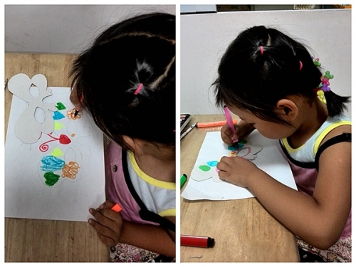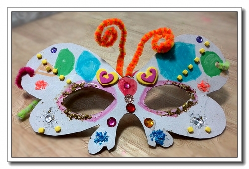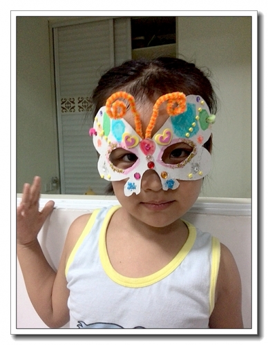 婷本来要继续做王冠的,但我实在是太抠门了,怕她一下子全做完了,于是鼓动她做别的。婷拿出张废衬纸来,要做面具。婷画的蝴蝶不够对称,我按着她的图样,进行了修整,婷怕一次画坏了,还在纸上很认真的做设计图。