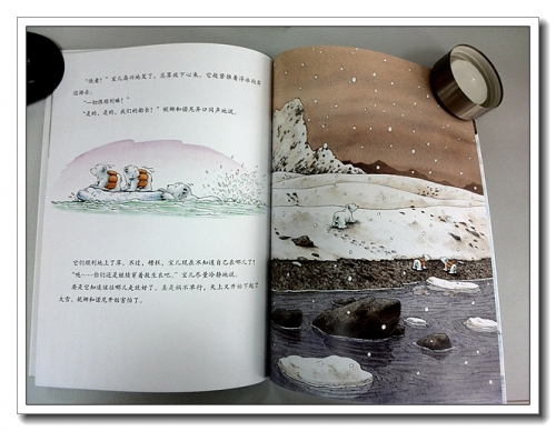 《小北极熊》全套9册,文字较多,适合5岁以上的孩子亲子阅读。我不主张孩子过早识字,这样在我们给孩子讲述的时候,她才会将注意力更多得放在画家精心绘制的画面和细节上,而不仅仅是欣赏这个故事的本身。比如潜水艇内部的构造;比如当人进来时,3只小北极熊不同的表情;比如那只腊肠犬身上穿的衣服,有一个和船上工作人员相同的救生圈的标志。