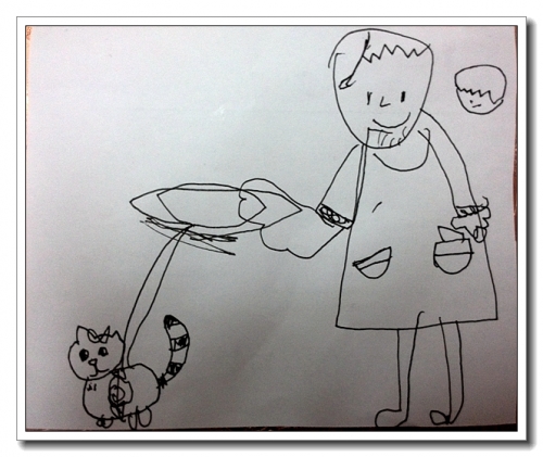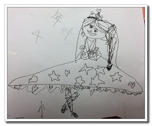 教师节到了,婷要送贺卡给老师。我从网上找了些图片给她参考,她却一概不喜欢。自己拿起笔来刷刷画了几张,一张是一个男孩子牵着猫,我特别喜欢这个孩子的衣服,我说了一句衣服画到脸上了,婷就在脸上添了些胡子;另一幅是跳芭蕾的小公主,都和可爱,可惜尺寸大了些,不适合。