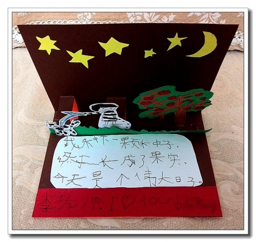 第一张,婷画了个洒种子的小男孩,我提出男孩和猫不在一个地平线上,婷说,那是因为猫在前面,人在远处。我建议她上色,后来才发现,黑白才是真绝色啊,总的来说,这张贺卡的视觉效果最棒。我哼了句“我种下一颗种子”,婷立刻说“对,我就是这个意思”,画了大树出来。我感觉背景空,建议画白云太阳,婷说背景那么深,必须得是晚上啊,于是画了星星月亮,倒于《小苹果》的歌词意外的搭。