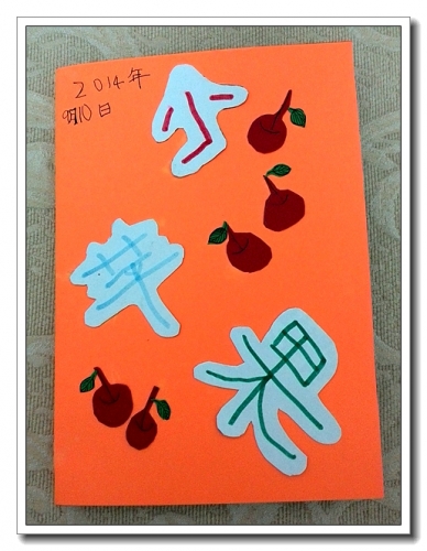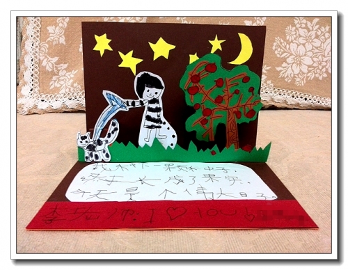 背景纸张的选择、文字、绘画都是婷制作,其中文字是我旁边示范给她的。我负责剪,与婷一起粘贴,和对封面设计适当做一些建议。