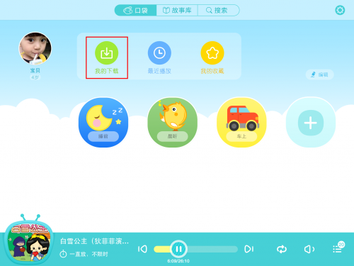 在家里连接WiFi 后,提前把宝贝想听的故事下载到本地,然后外出旅游玩耍时,进入【口袋-我的下载】,播放故事,这样就不会消耗流量了 ^_^