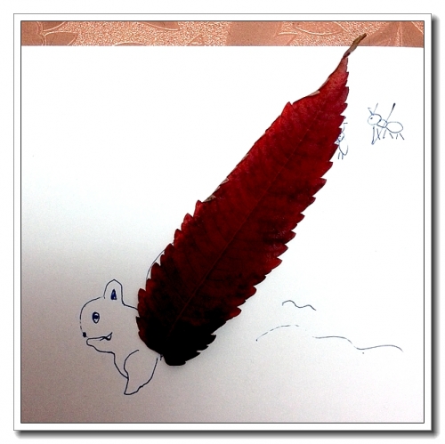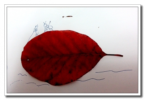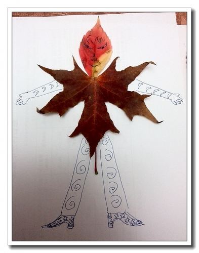去年还是前年,幼儿园要求过一次树叶画的作业,之后我们再也没做过这样的活动——我的想象力不行。去登山,小小的山头红绿相衬,亭台掩映,清流淙淙,鸟鸣啾啾,忽然便起了创作的心思,捡了些红叶带回,送给婷做礼物。