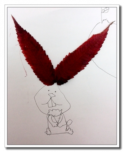 听说要做树叶画,婷的兴趣高涨。我们俩一人拿了一张纸,各占一地,开始挥毫。
