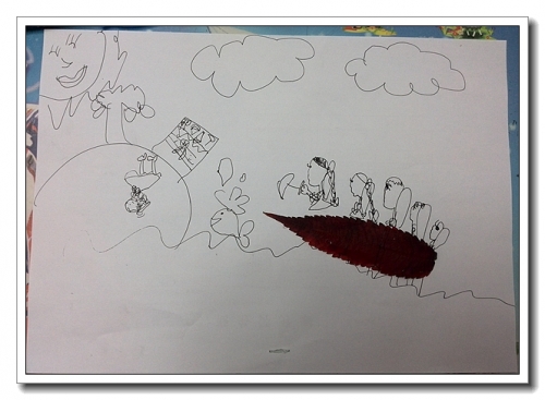 这两只是婷的作品,兔子十分形象,龇牙咧嘴,手捧胡萝卜。次一张让我一下联想起诺亚方舟。
