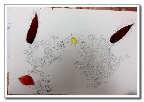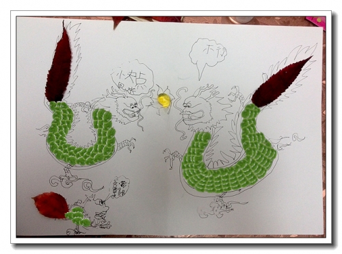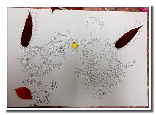这是我们俩的合作,我想给婷显摆一下,可惜越画越没耐心,而且画完后才发现大小比例过于失调。婷给了极佳的注释,这是龙爸和龙妈,她还给龙妈加上了销魂的眼睫毛。然后婷顺手添加了龙宝儿,我感觉像狮子狗,婷爸说是麒麟。