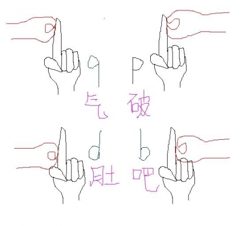 11。重点来了,qpdb。这四个是四胞胎啊,长得太像了。太容易混了。我起先是分开想的,后来又觉得应该把它们联系起来,这样更好联想。竖起一根手指,另一只手作圆形比划。